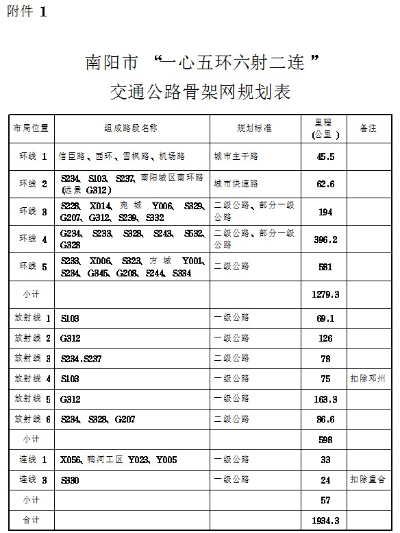 5.“五环”线由S233线、X006线、S323线、方城Y001线、S234线、G345线、G208线、S244线、S334线组成,规划为二级公路,全长581公里。其功能定位是以中心城区为核心的90分钟交通圈,服务南召、西峡、淅川3个县城、产业集聚区及2026世界杯预测周边偏远乡镇之间的交通联系,服务伏牛山旅游开发。