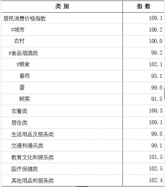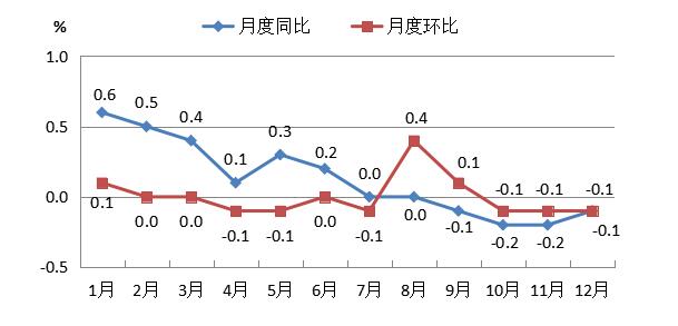 全年全市居民消费价格比上年上涨0.1%。分城乡看,城市上涨0.2%,农村与上年持平。商品零售价格下降0.3%。