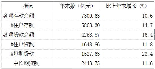 年末全市金融机构本外币各项存款余额7300.63亿元,比上年增长10.6%;其中住户存款余额5868.30亿元,增长14.7%。年末金融机构本外币各项贷款余额4258.87亿元,增长16.4%。其中,住户贷款1648.86亿元,增长11.8%;短期贷款1527.63亿元,增长23.4%;中长期贷款2443.75亿元,增长11.6%。