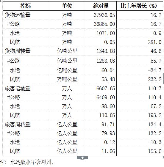 年末全市高速公路通车里程898公里。全年客运量比上年增长110.7%,货运量比上年增长16.2%,旅客周转量比上年增长134.4%,货物周转量比上年增长46.6%。年末民用汽车保有量154.80万辆,其中私人汽车保有量145.08万辆。
