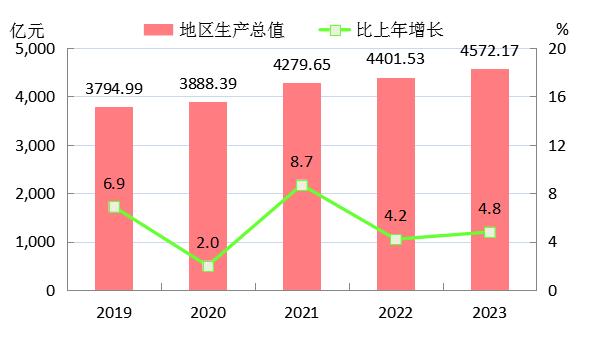 初步核算,全年全市生产总值4572.17亿元,比上年增长4.8%。其中,第一产业增加值736.27亿元,增长2.1%;第二产业增加值1315.79亿元,增长5.7%;第三产业增加值2520.11亿元,增长5.1%。三次产业结构为16.1:28.8:55.1。人均生产总值47846元,比上年增长5.5%。