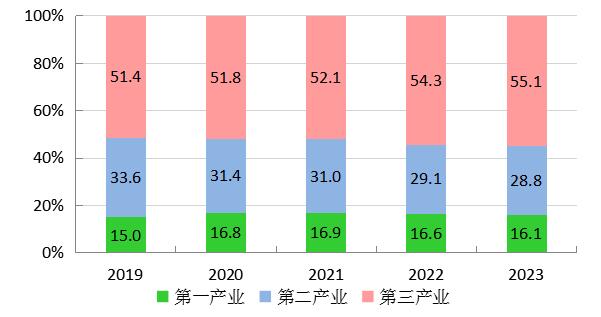 图2 2019-2023年三次产业增加值占地区生产总值比重