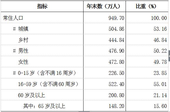 年末全市常住人口949.70万人。其中城镇常住人口504.86万人,常住人口城镇化率为53.16%。全年出生人口6.30万人,出生率6.59‰;死亡人口8.40万人,死亡率8.79‰;人口自然增长率为-2.2‰。