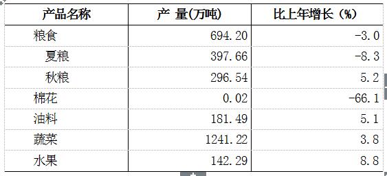 全年全市粮食产量694.20万吨,比上年减产3.0%。其中,夏粮产量397.66万吨,减产8.3%;秋粮产量296.54万吨,增产5.2%;小麦产量397.52万吨,减产8.3%;玉米产量247.86万吨,增产7.0%。
